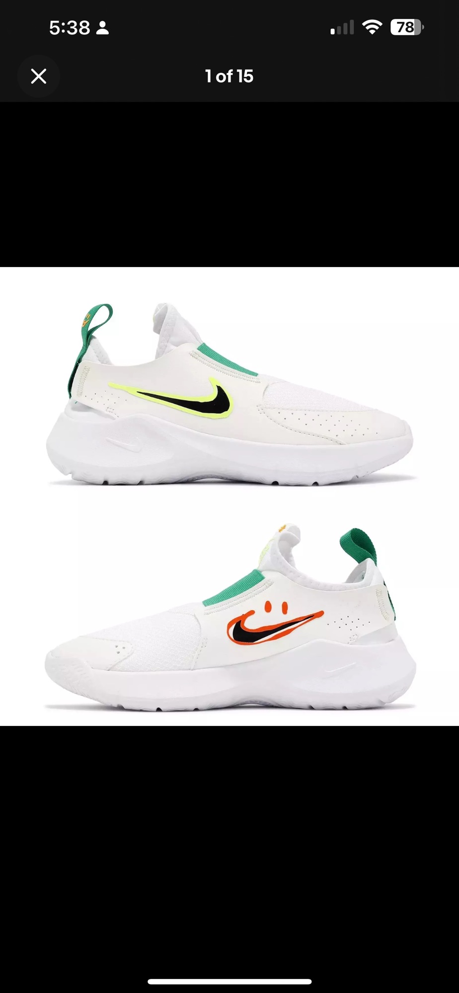 Nike Flex Runner 3 GS White Green Orange Kids Youth Size 6Y Running HF5745 101 Youth Size 6Y입니다. Women size 8입니다 새제품인데 박스만 윗부분이 없습니다.
