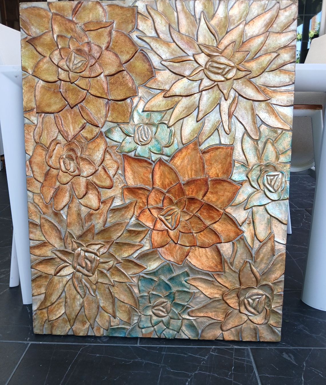 입체감 있고 메탈의느낌이나는 꽃 문양의 작품입니다. 여러가지 색감의 조화로 어디든 어울리는 인테리어소품이됩니다.