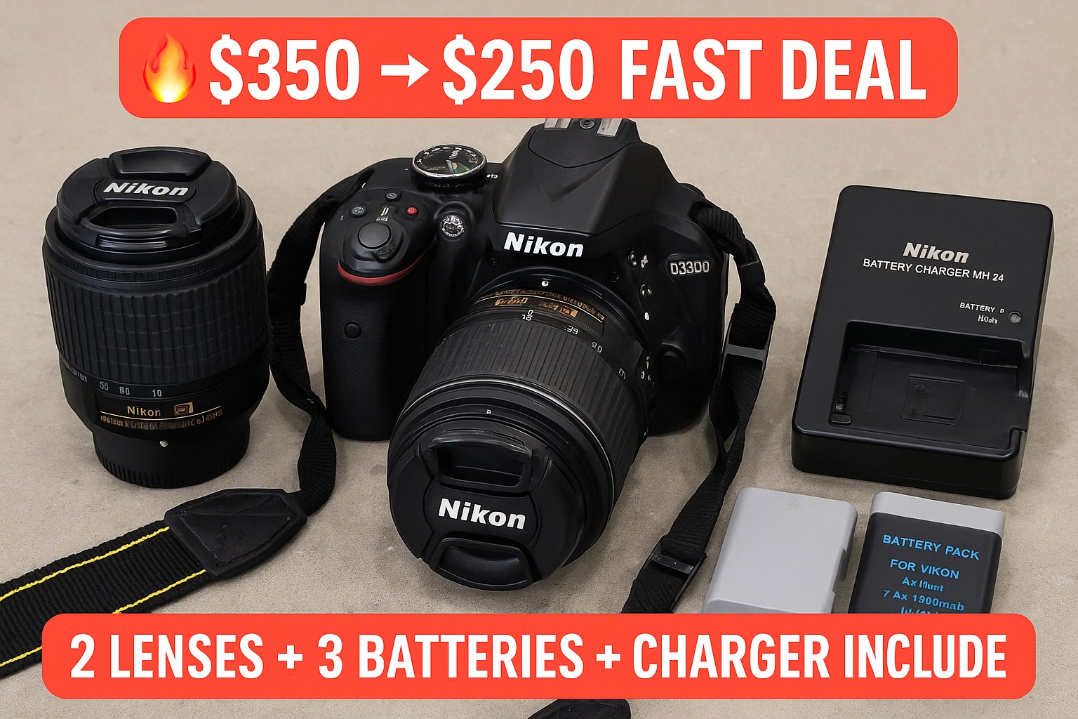 💰 빠른 거래 시 $285‼️ 👉 이 가격에 풀세트는 거의 없어요 🚀 ✅ 구성품 • Nikon D3300 바디 • AF-S DX NIKKOR 18-55mm f/3.5-5.6G VR II • AF-S DX NIKKOR 55-200mm f/4-5.6G ED VR II • 정품 충전기 + 배터리 총 3개 (정품/호환) • 넥스트랩 ✅ 상태 • 정상 작동 100% • 외관 사용감 적고, 렌즈/마운트 깨끗함 (사진 참고) • 입문·취미·여행용으로 딱 좋은 세트 ✨ 💬 판매 사유 제 남동생이 사진 취미를 처음 시작할 때 사용하던 카메라입니다. 지금은 새 기종으로 업그레이드해서 필요하신 분께 좋은 가격에 드려요 😊 📷 샘플 촬영 컷 (실제 이 카메라로 촬영) • 🏙 San Francisco 도심 스냅 • 🌊 Huntington Beach 바닷가 풍경 (장노출) • 🌌 Arizona 은하수 천체사진