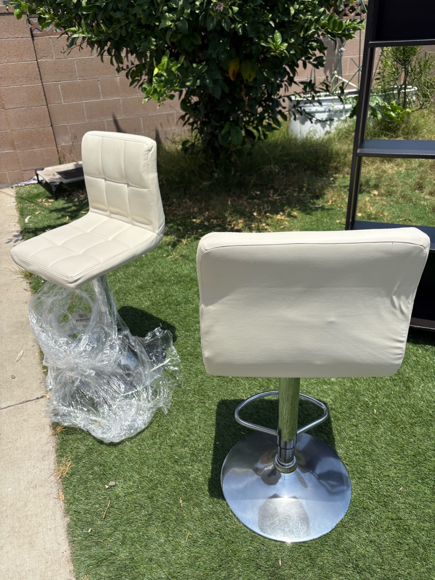 아일랜드에 사용하는 Barstool. 높이 조절되고 발 받침 있습니다. Waterproof 원단이고 흰색이라 부엌에 높으면 깔끔하고 예쁩니다. Set of 2 stools Adjustable seat height (approx. 24” and up) White faux leather with chrome base 360° swivel