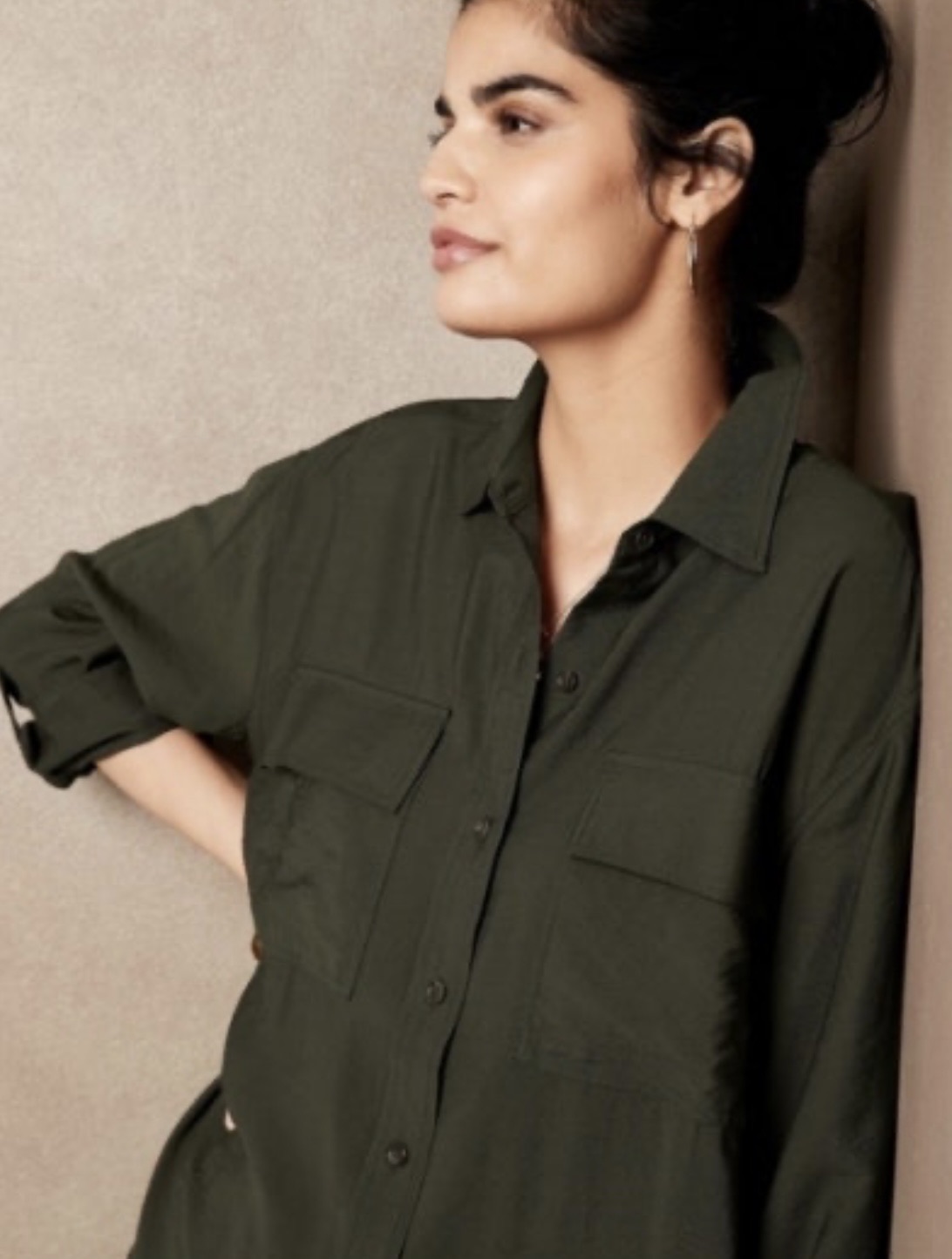 바나나리퍼블릭. 롤업 셔츠. 스몰 진한 카키빛의 루즈하고 박시한 여유있는 핏의 롤업셔츠 데일리 디자인이예요 새상품 착하게 데려가세요 Cash🧡 노스리지 갤러리아 마켓외 다양한 장소 타협 가능❤️