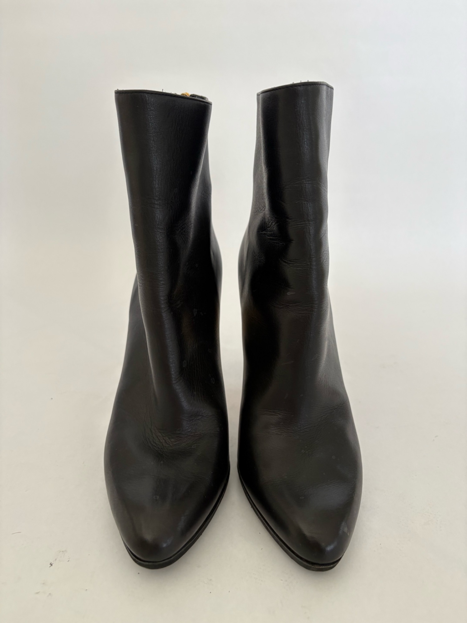 지미추(Jimmy Choo) 블랙 가죽 앵클 부츠입니다. 이탈리아 생산 천연 소가죽(Vero Cuoio) 제품으로, 골드 힐 포인트와 뒤 지퍼 디테일이 고급스럽습니다. • 사이즈: EU 36.5 • 컬러: 블랙 • 소재: 천연 가죽 (이탈리아 생산) • 굽: 슬림 힐 + 골드 포인트 • 상태: 전체적으로 양호 / 바닥 사용감 약간 있음 • 정품 박스 포함 발렌시아. 한타부근직거래가능. 젤벤모가능. 노리턴
