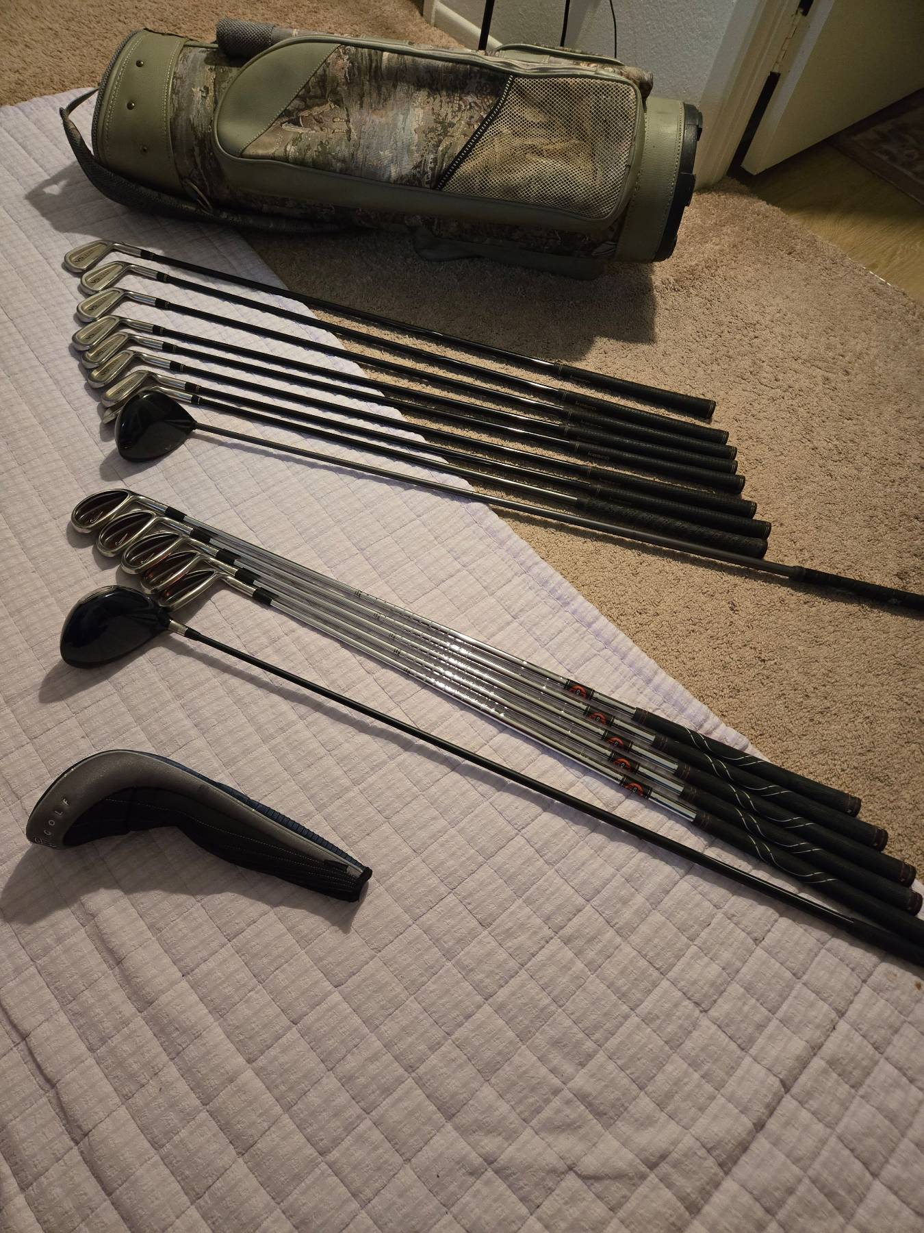 나이키 아연 4.5.6.8.9 드라이버1개커버포함 => 6개 V.S 아연 3.4.5.6.7.8.9.A 드라이버 1개 =>9개 골프백도 같이 드림니다.빽 위 커버가 없지만 상태는 좋습니다. 그리고 그립도 괜찮습니다.
