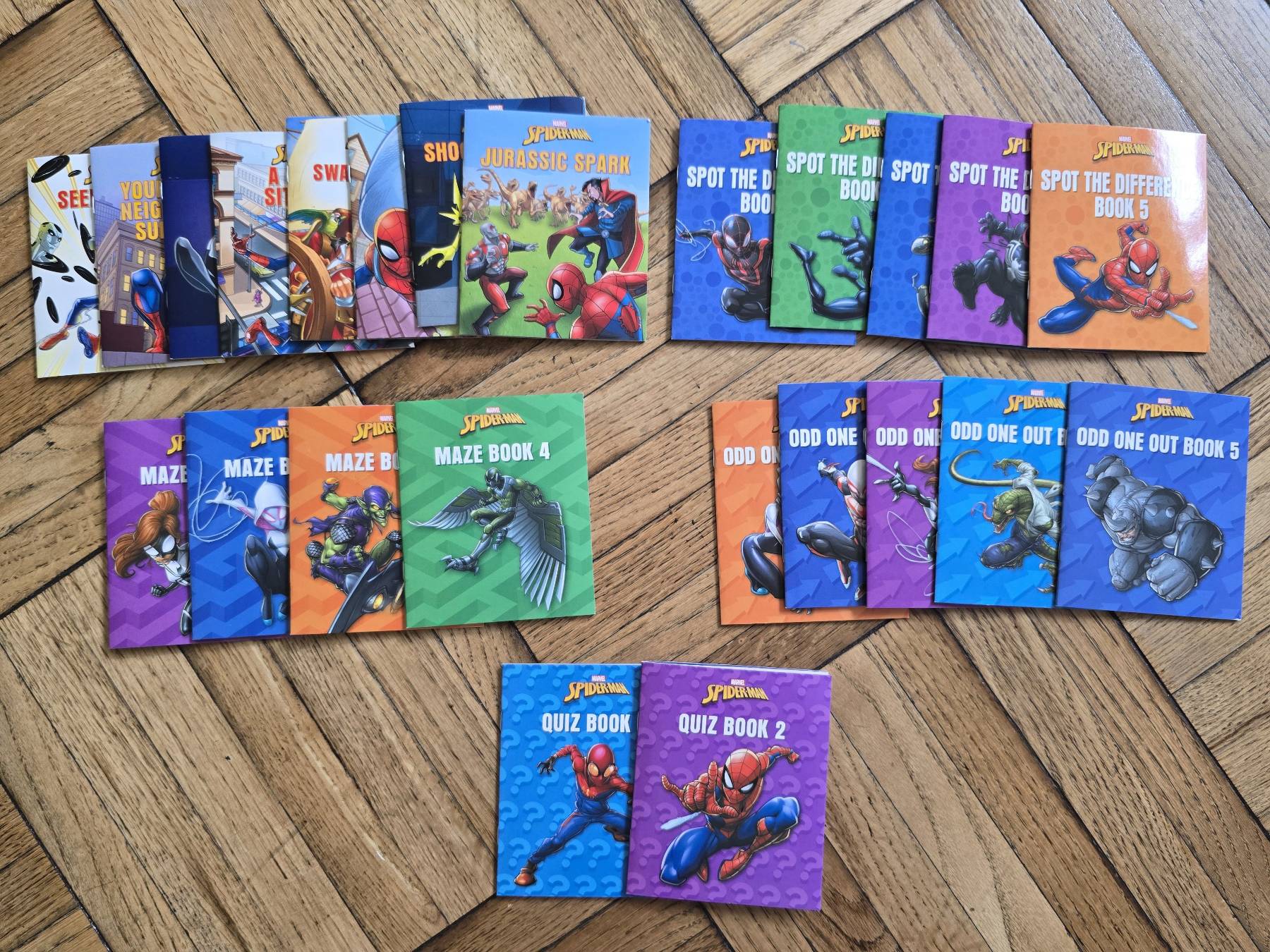 스파이더맨 액티비티 캘린더입니다 24개 미니 액티비티 책으로 구성되어있어요( 미로, 다른그림찾기, 퀴즈, 틀린그림찾기, 에피소드 글책) 눈으로만 봐서 깨끗해요. 미니책이라 여행갈때 심심하지않게 놀수 있어요. origami 종이접기책도 같이 드려요 park la brea에서 거래원해요