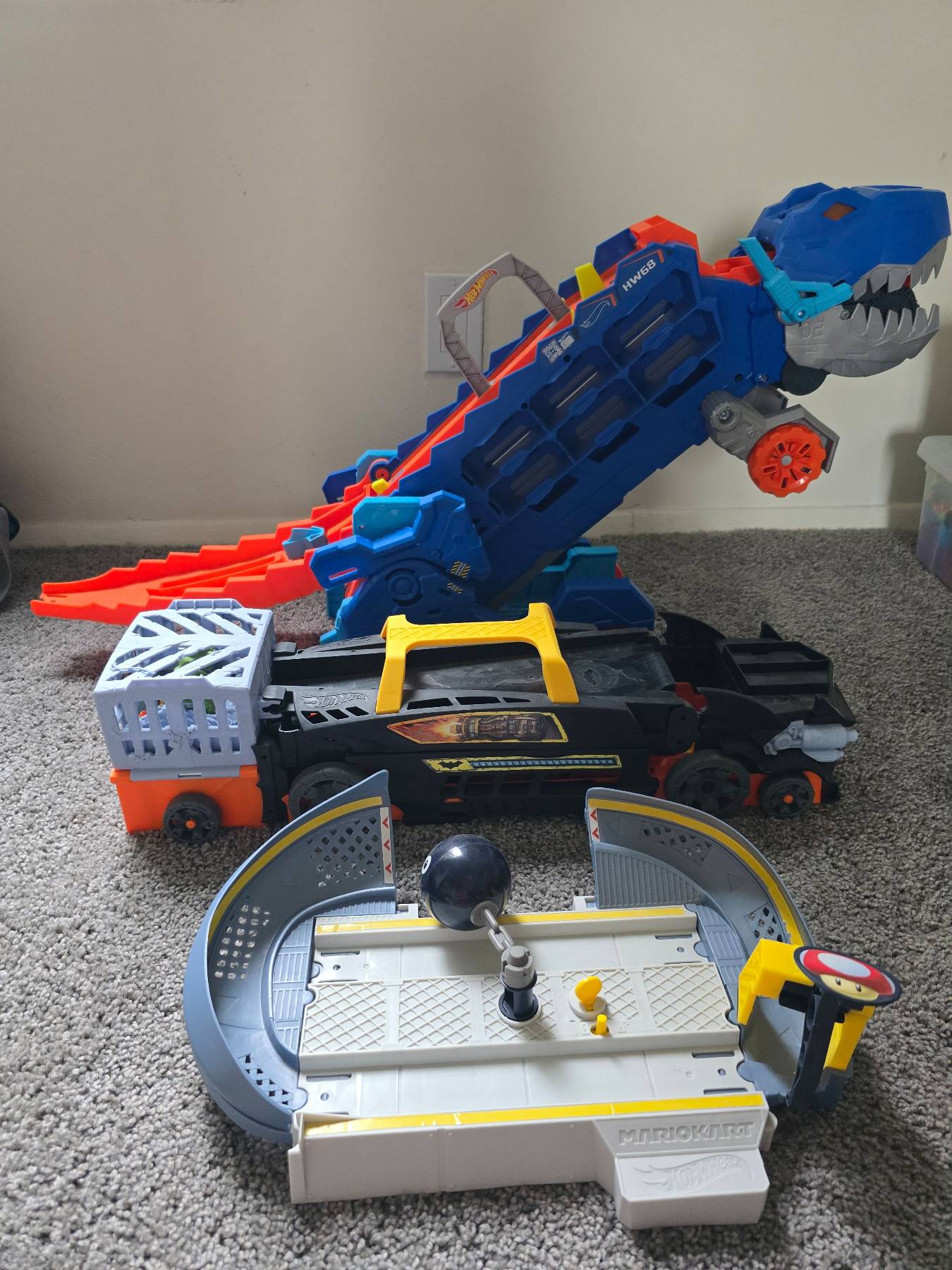 Hot wheel 자동차 레이스할 수 있는 트랙, 트럭, 마리오 핫휠 레이스 트랙 총 3종 일괄팝니다. 아마존 캡처본 참고하시면 되고, 오프라인 매장에서 모두 직접 새상품 구매하여 썼습니다 -공룡 트랙은 소리, 불 나오고 모양변형가능해요 -배트맨 트랙은 펼치고 다시 트럭으로 접을 수 있고 마지막에 초록 몬스터가 나오기도합니다. -마리오 트랙은 장난감 키면 가운데 대포가 돌아가면서 트랙 레이스를 방해하는 구조입니다. 아이혼자 놀아서 깨끗해요. Park la brea에서 거래 원합니다