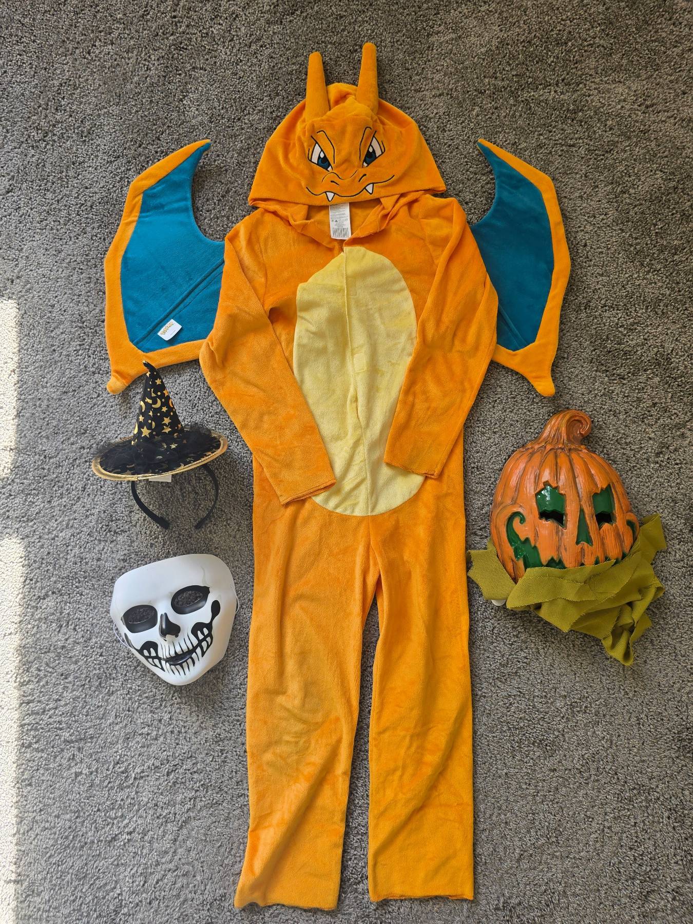2025년에 새상품 직접 구입한 리자몽(charizard) 할로윈 코스튬입니다. 날개는 탈부착 가능합니다. 사이즈는 S(4-6세용)이고요 아이가 좋아해요 기타 어른들이 착용가능한 마녀 머리띠, 호박 및 스켈레톤 가면 같이 드려요 미리 할로윈 싸게 준비하세요^^ Park la brea에서 거래원해요