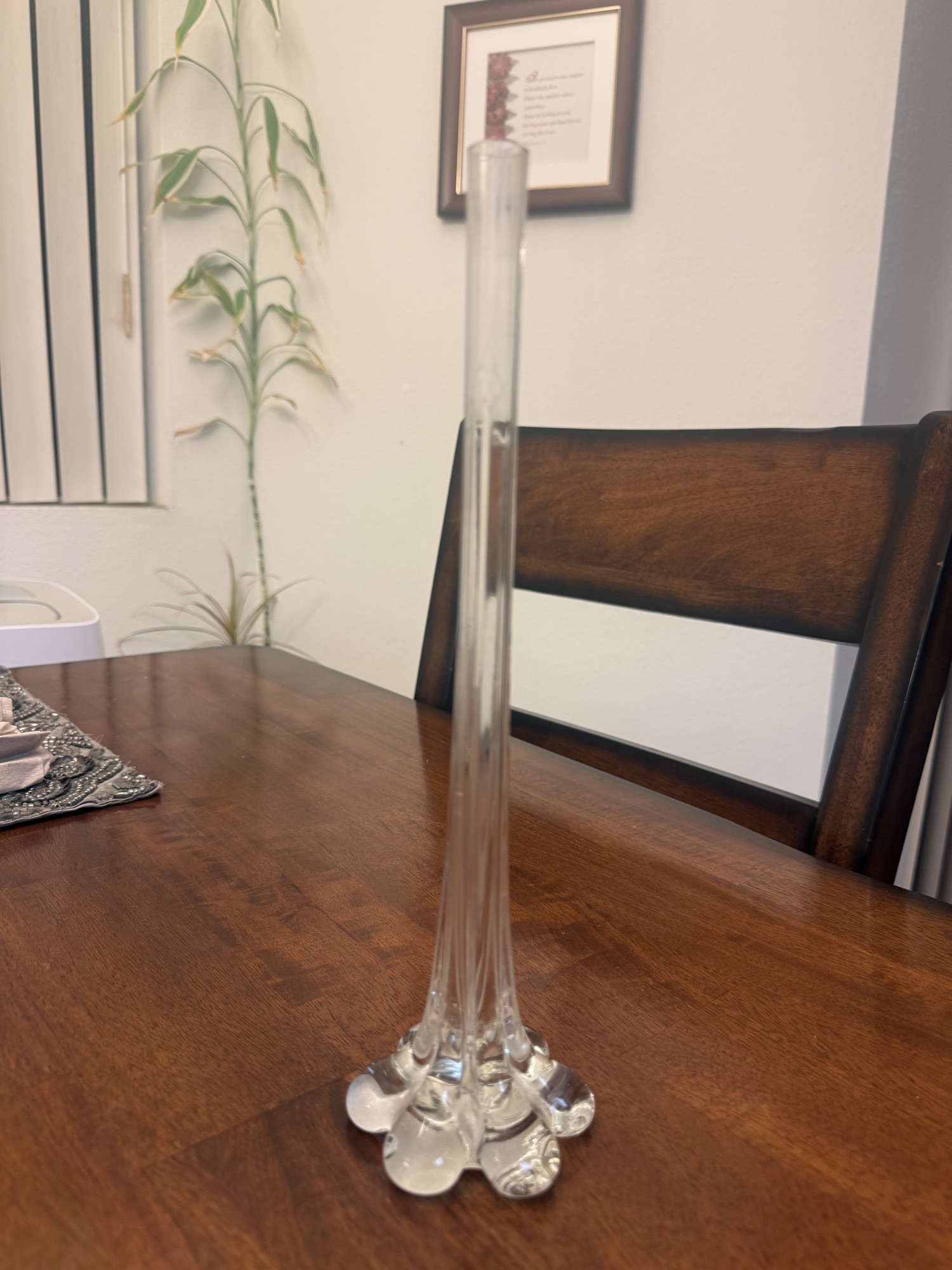 유리로된 한송이만 꽂을수 있는 유리 꽃병에요. 높이는 11inch 물건은 토랜스 그리고 코리아타운에서 받으실수 있어요.