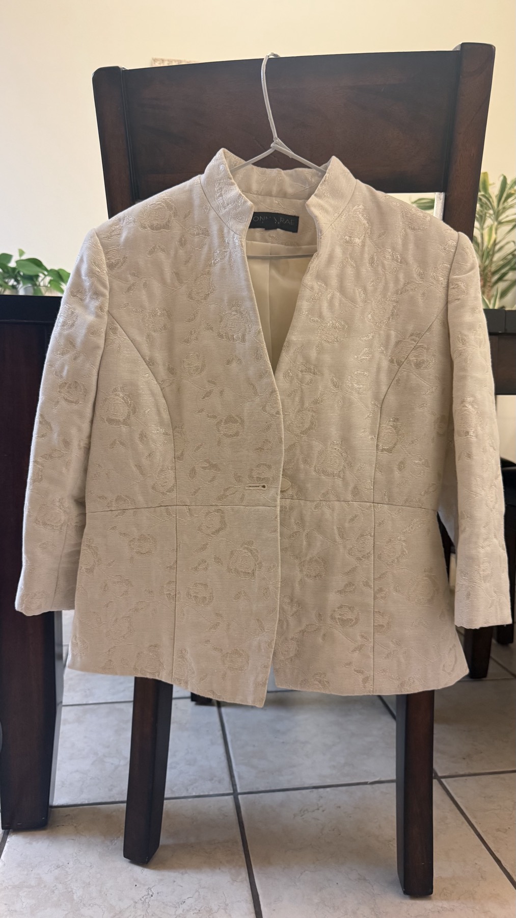 흰색 자켓 팔소매 7부 옷감은 약간 도톰하고 옷감에 자수가 있어서 고급진 자켓 입니다. 안에 어떤칼라의 원피스 겉에 자켓을 입어도 어울립니다. 목 뒷부분이 약간 표시가 나는데 아마 드리이 클리닝 하면 깨끗 해 질거에요. 사이즈 6p 제품은 토랜스 가디나 코리아타운에서 받으실수 있습니다.