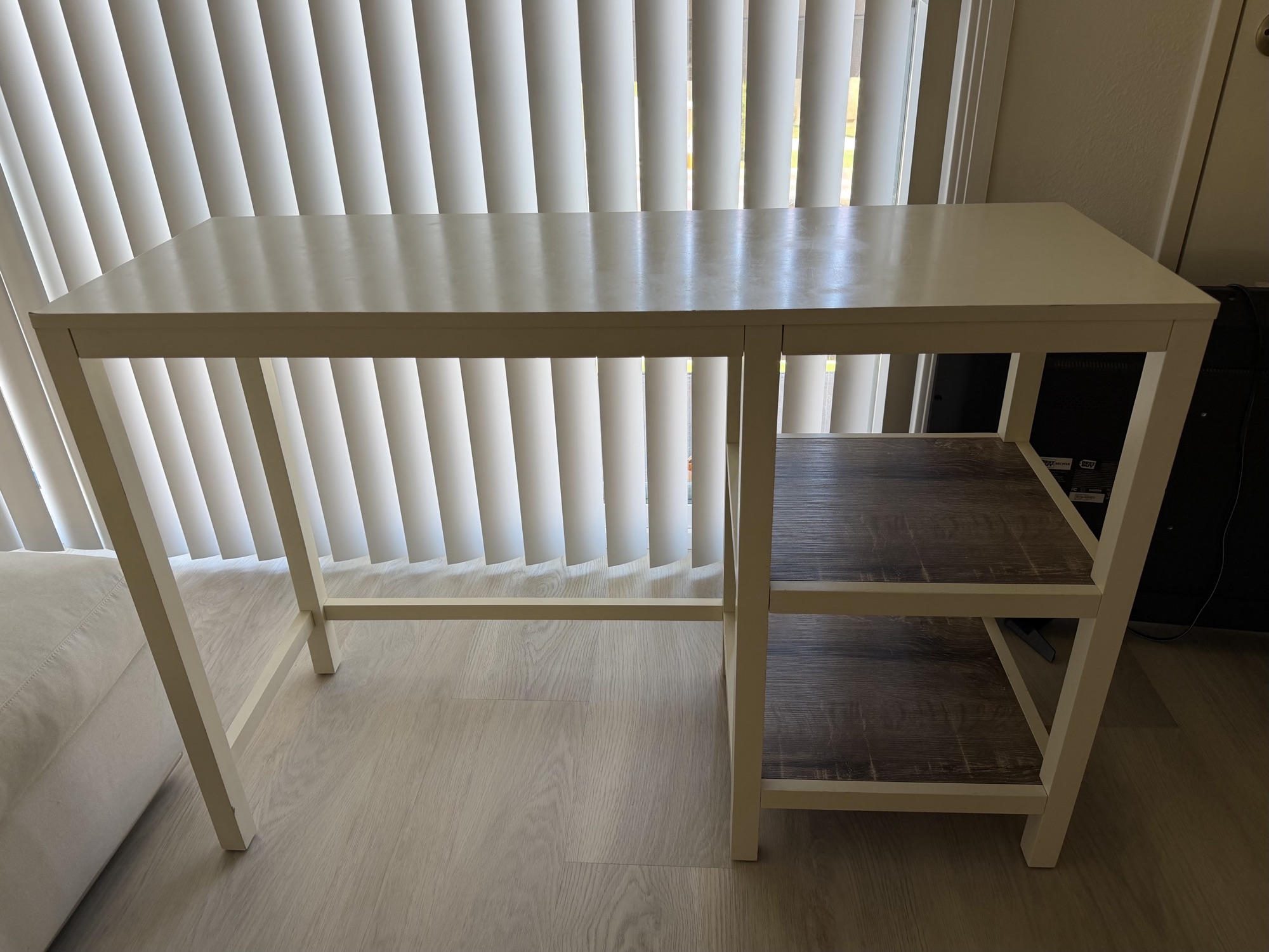 가격 25불로 내려요 ~~ 컨디션 좋아요 153/4 X44 (30 “ 높이) 책상으로 잠깐 쓰다 진열장으로도 쓰다 화장대로도 잠시 사용 했어요 ~ 생활감 있지만 잘 사용해서 깨끗해요 .. 위부분에 손자국은 딱아 드릴게요~~ ^^ 아기가 있어서 공간 더 쓰기 위해 내 놓습니다. 물건 구입 하시면 다른 선물 항상 드렸어요 무료 나눔 ^^