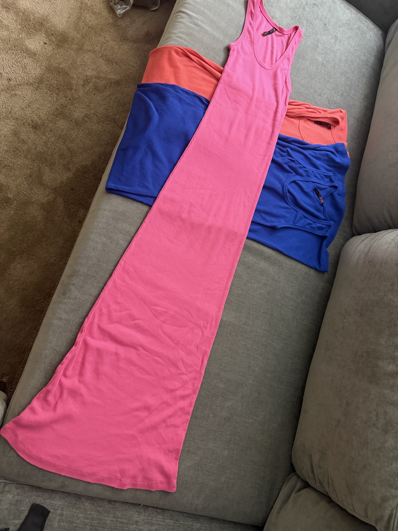 오랜지 / 핑크는 스몰이고 블루는 미듐입니다 새거입니다 여름 원피스나 집에서 입기도 편할거 같아요. 3 개에 10 불 드립니다 !