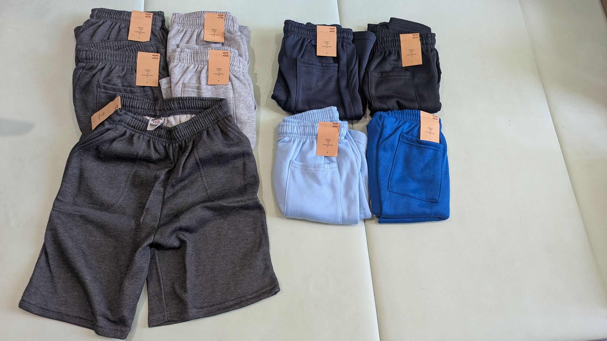 미사용 새상품 반바지 입니다. 남녀공용. 무릎을 살짝 덮는 정도의 길이. S -회색3개,실버2,네이비,검정,파랑,하늘색각1개. 얇아서 몸에 휘감기는 원단이 아니라, 약간의 두께감이 있어 모양이 무너지지 않는 원단입니다. 개당 5불, 9벌 모두 구매시 35불. 한타픽업