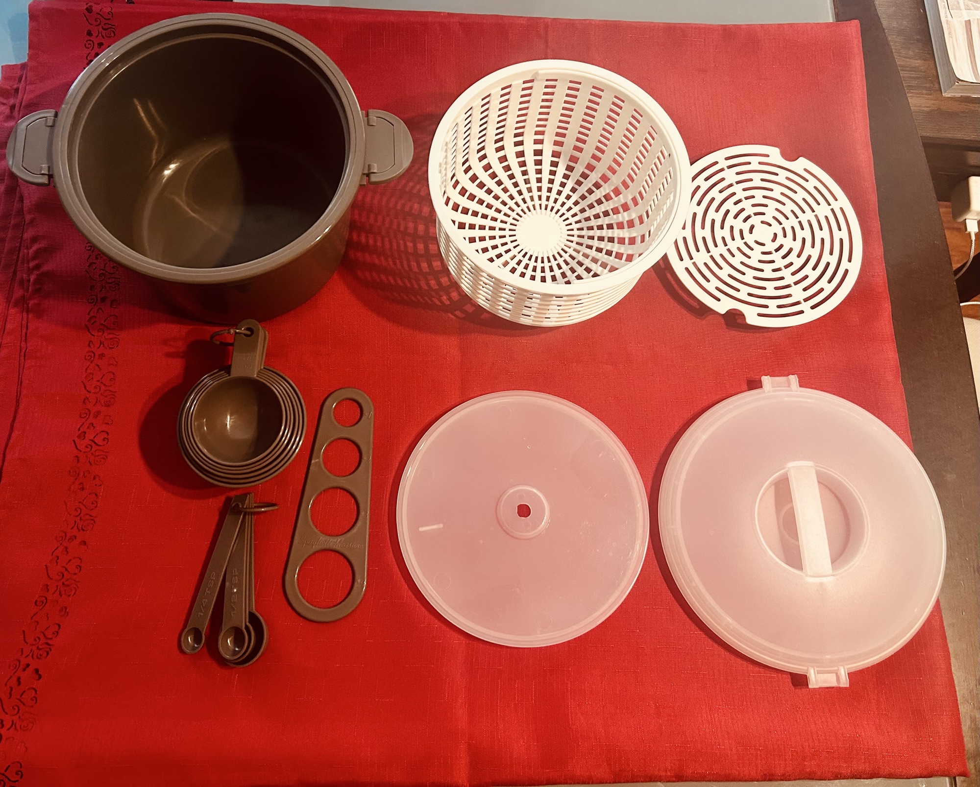 Prep Solutions 전자레인지용 밥/파스타 쿠커 세트입니다. 한 번 사용 후 깨끗하게 보관한 최상급 상태입니다. • 사이즈: 지름 약 9인치 / 높이 약 6인치 • 구성: 16피스 세트 (본체, 잠금 뚜껑, 스팀 인서트, 파스타 측정기, 계량컵 및 스푼 세트 포함) • 특징: * 12컵 대용량, BPA Free 재질 • 밥, 파스타, 채소 찜 등 간편 요리 가능 • 상태: 흠집이나 오염 없는 '새것 같은' 상태입니다.