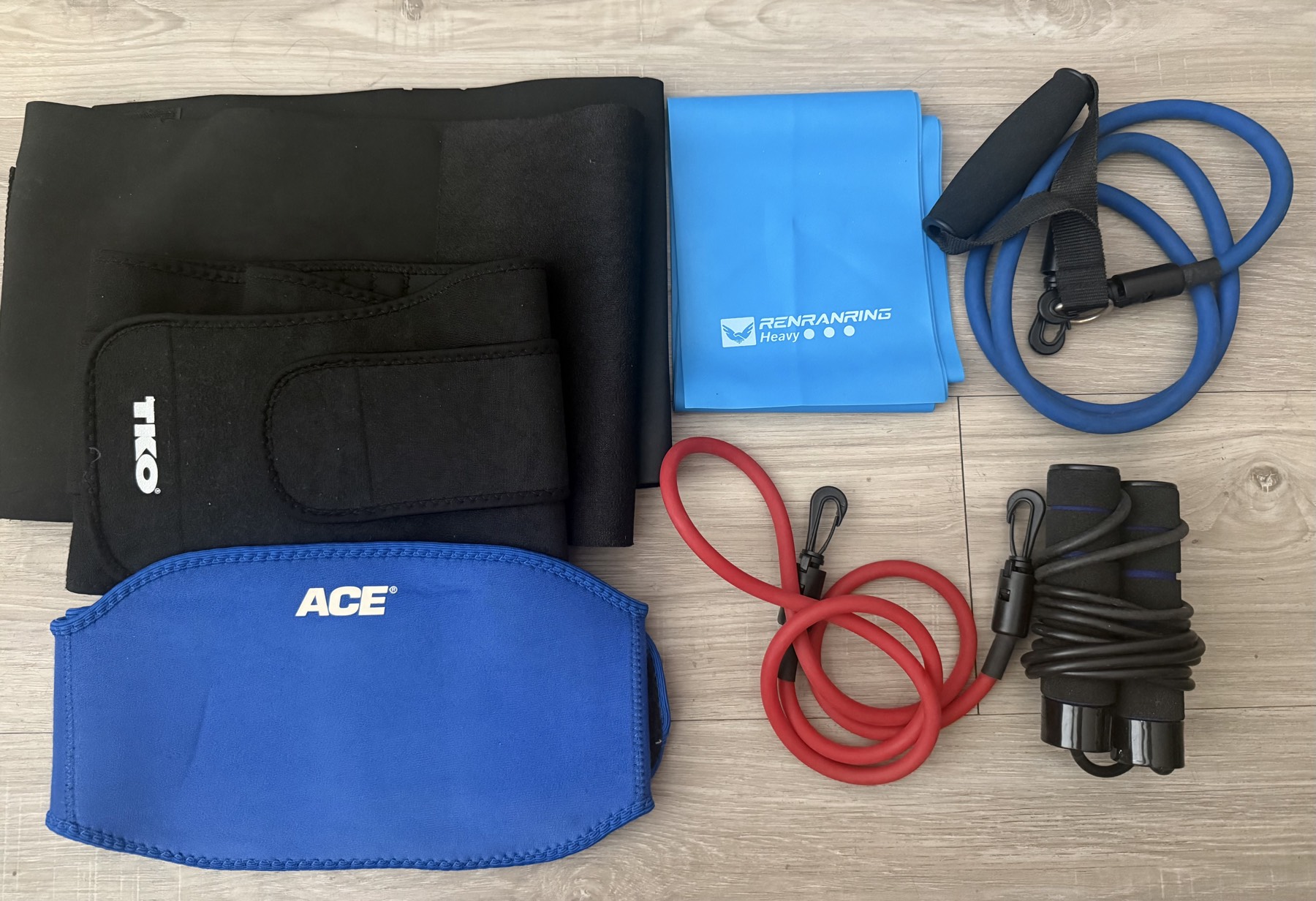 운동시 필요한 허리보호대, 줄넘기, 스트레치 고무벨트 등등 입니다. 전부 함께 $3입니다.
