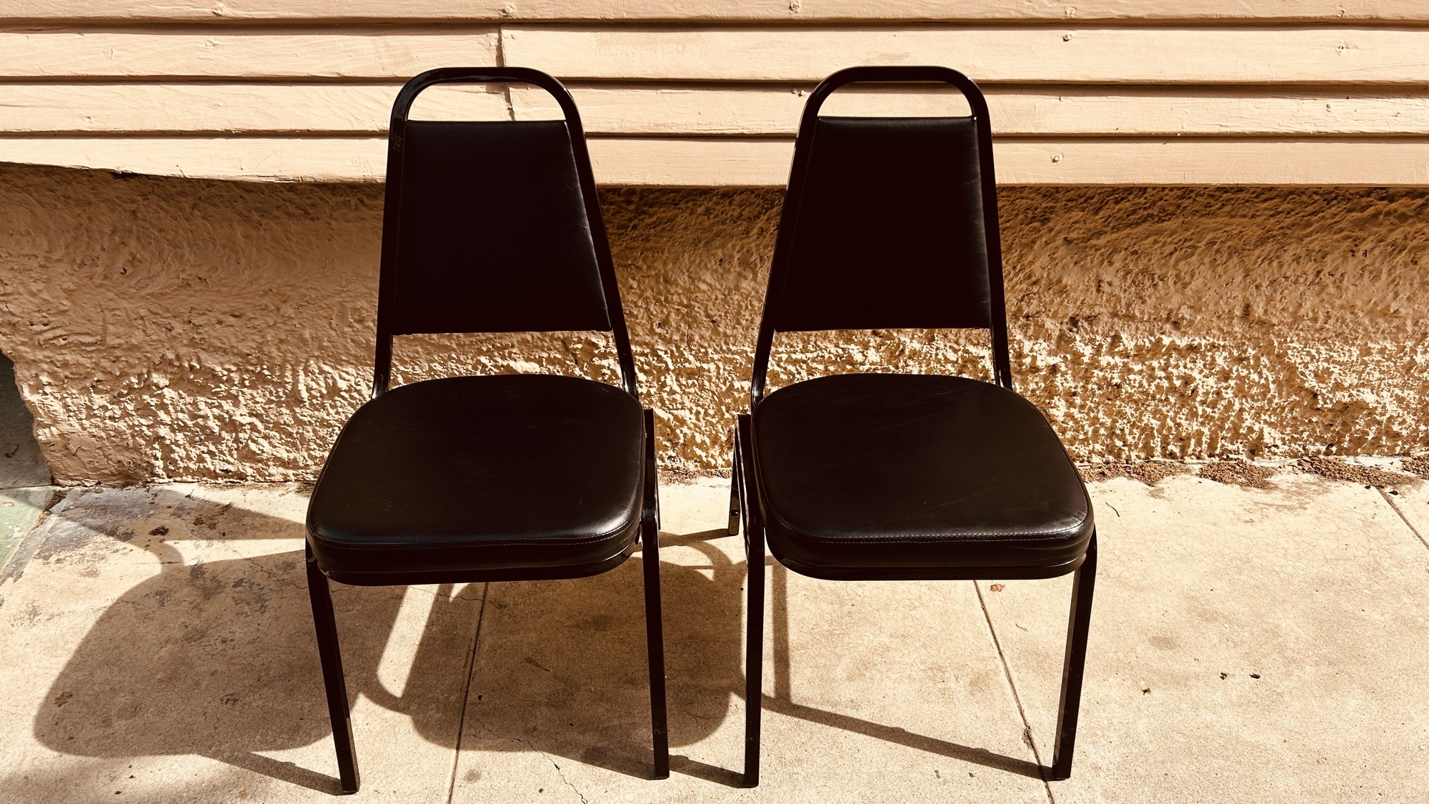 사진에 보시는 것과 같은 튼튼한 블랙 의자 2개 일괄 판매합니다. 사무실 보조 의자나 손님용으로 쓰기 아주 좋습니다. 겹쳐서 보관이 가능해 공간 차지도 적어요. • 상태: 사용감은 좀 있지만 쿠션 꺼짐 크게 없고 튼튼합니다.(스크래치는 사진 봐주세요) • 수량: 2개