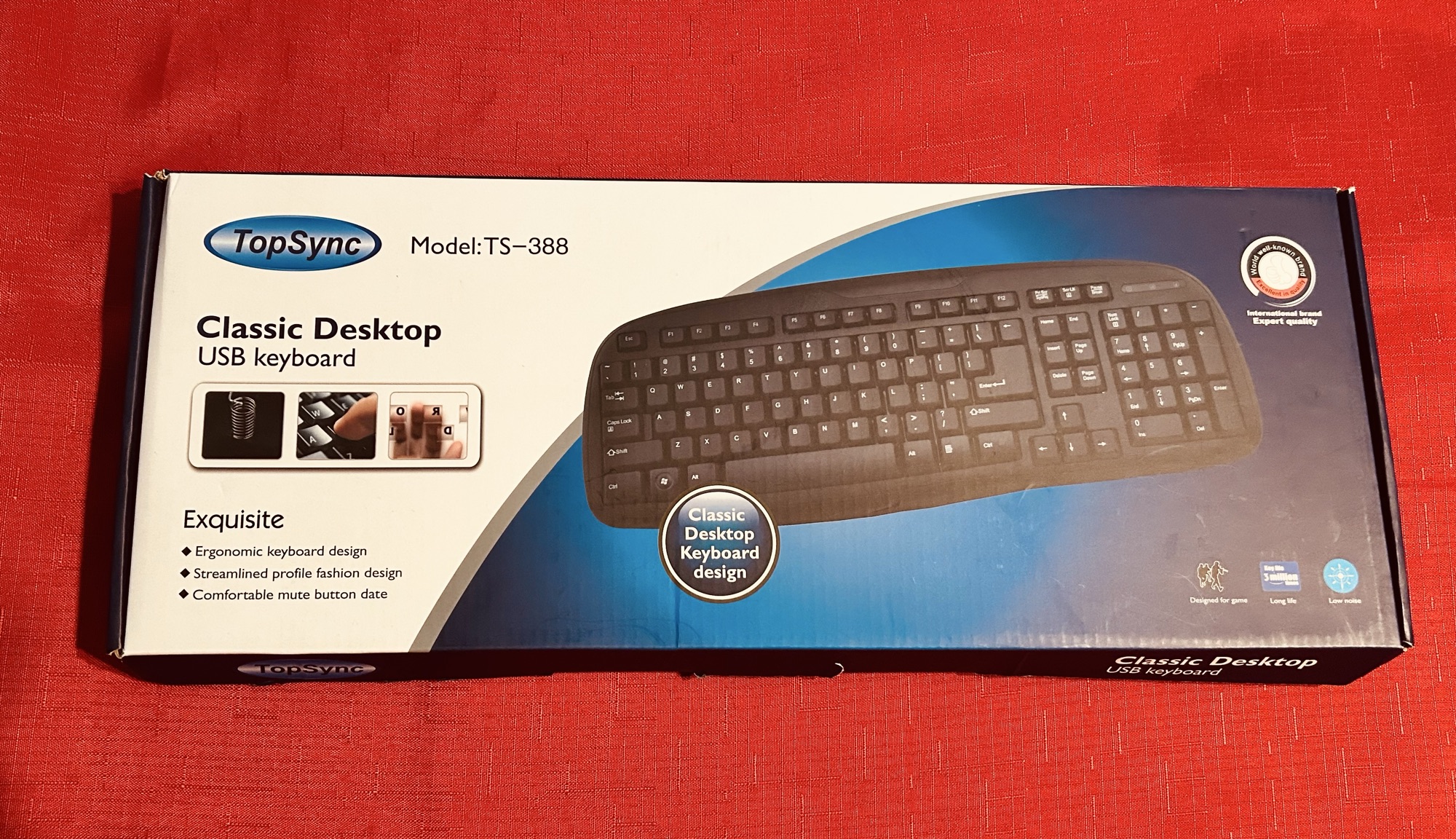 상태는 사진 보시다시피 박스까지 있는 아주 깨끗한 상태예요. 곡선형 디자인이라 타이핑하기 편하고, 숫자 패드도 따로 있어서 사무용이나 가정용으로 쓰기 딱 좋습니다. • 모델명: TopSync TS-388 • 상태: 매우 깨끗 (박스 포함) • 연결방식: USB 유선 (연결만 하면 바로 작동)
