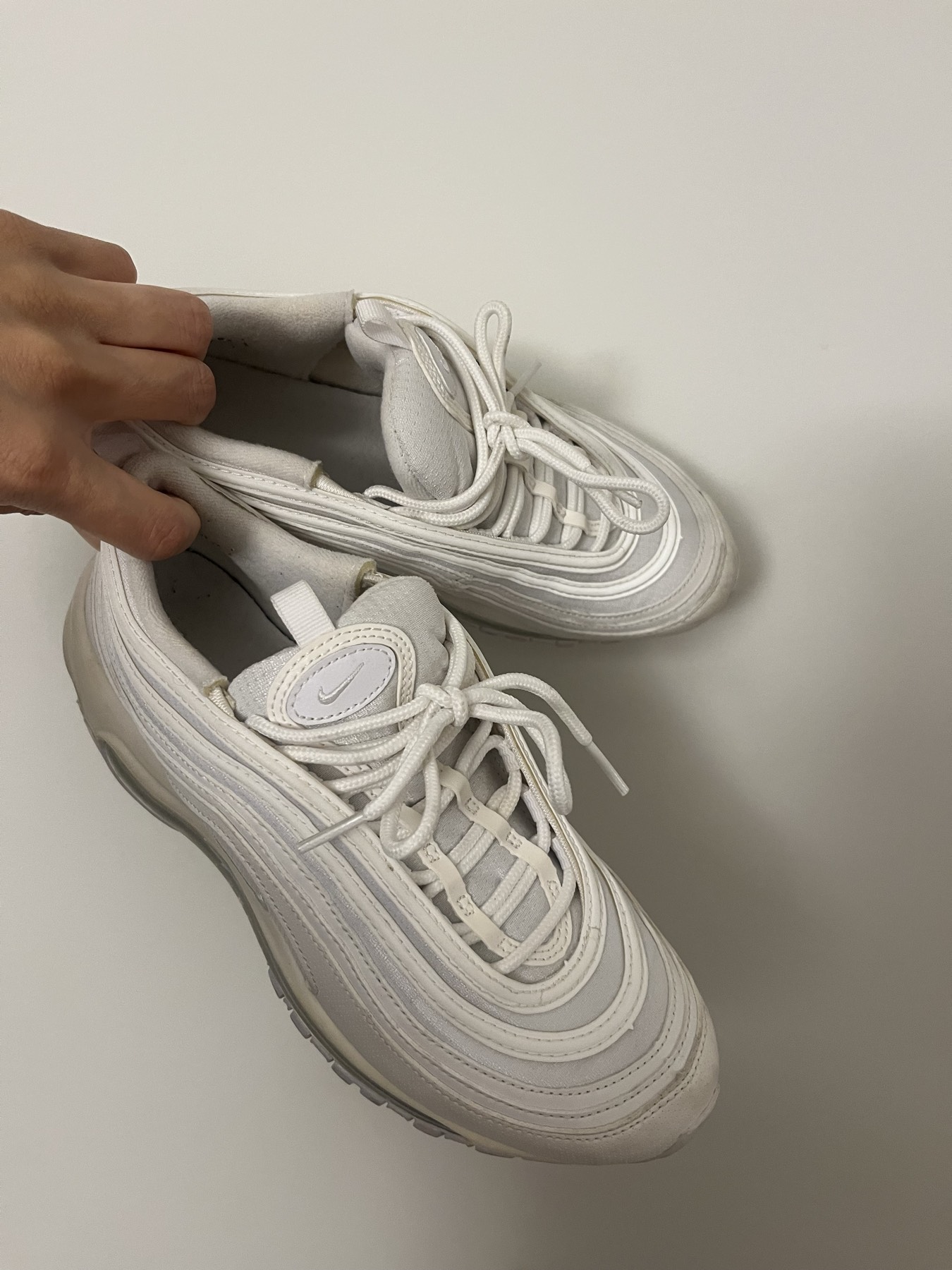 한...5년전쯤 코엑스 나이키에서 구매한것 같은 에어맥스 97 인데요, 봄맞이 옷정리하다보니 짠! 하고 나왔지만 발이 맞지 않아 판매합니다. 밑장은 사진에서 보시듯 별로 안닳았어요. 사이즈 맞으시는분이 저렴하게 가져가 신어주세요😊