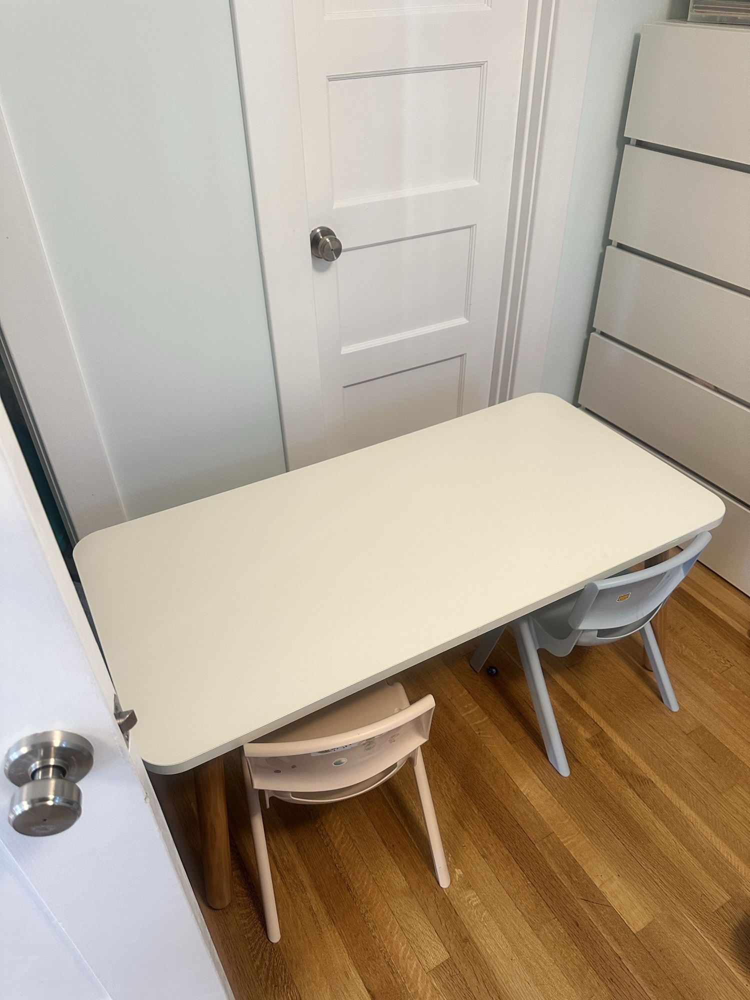 현대 리바트 '꼼므 1200' 유아 책상 세트 판매 파스텔 톤의 테이블 1개와 의자 2개가 포함된 구성입니다. 최근 한국에서 이사를 오며 새 책상을 구매하게 되어, 그동안 잘 사용하던 아이들 책상을 판매합니다. 현대 리바트 꼼므(Comme) 1200. [상세 정보] • 상태: 4년 사용, 전반적으로 깨끗하게 관리했으나 일반적인 사용감은 있습니다. • 사이즈: 1200mm(가로) × 595mm(세로) × 500mm(높이) • 주요 특징: • 안전을 위한 라운드 모서리 처리 • E0 등급 친환경 소재 사용 • 아이 두 명 혹은 부모님이 마주 앉아 숙제를 도와주기에 충분한 넉넉한 공간 • 원가: 현재 한국에서 약 168,000원($125) 정도에 판매되고 있습니다. • 지역: S Guadalupe Ave Redondo Beach • 참고 사항: 직접 가져가셔야 합니다(Pick-up)