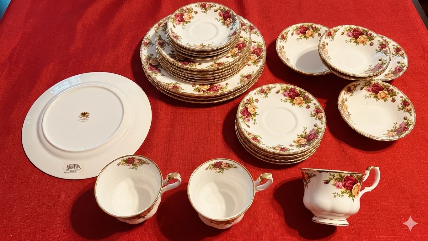 로얄 알버트 황실장미(Old Country Roses) 정품 세트 판매합니다. 장식장에만 보관해 두어 상태가 신품급(Mint Condition)으로 완벽합니다. 금테가 신품처럼 반짝거리고, 칩이나 크랙은 전혀 없습니다. 사진에서 보시는 것처럼 아주 깨끗하고 고급스러운 세트입니다. 인도네시아 생산 제품이며 뒷면 스티커 그대로 있습니다. 원래 풀세트 구성이었으나, 컵과 볼이 각각 하나씩 파손되어 총 22피스 구성입니다. 3인용 세트로 쓰시기 딱 좋은 알찬 구성이며, 접시는 4장씩이라 넉넉합니다. 실사용하시거나 기존 세트에 보충용으로 쓰시기에도 최상입니다. 구성 (Total 22 Pieces): • Dinner Plates (대): 4장 • Salad Plates (중): 4장 • Bread Plates (소): 4장 • Fruit/Dessert Bowls: 3개 (1개 부족) • Tea Cups: 3개 (1개 부족) • Saucers (컵 받침): 4장 박스랑 2피스 모자라 싸게 팝니다