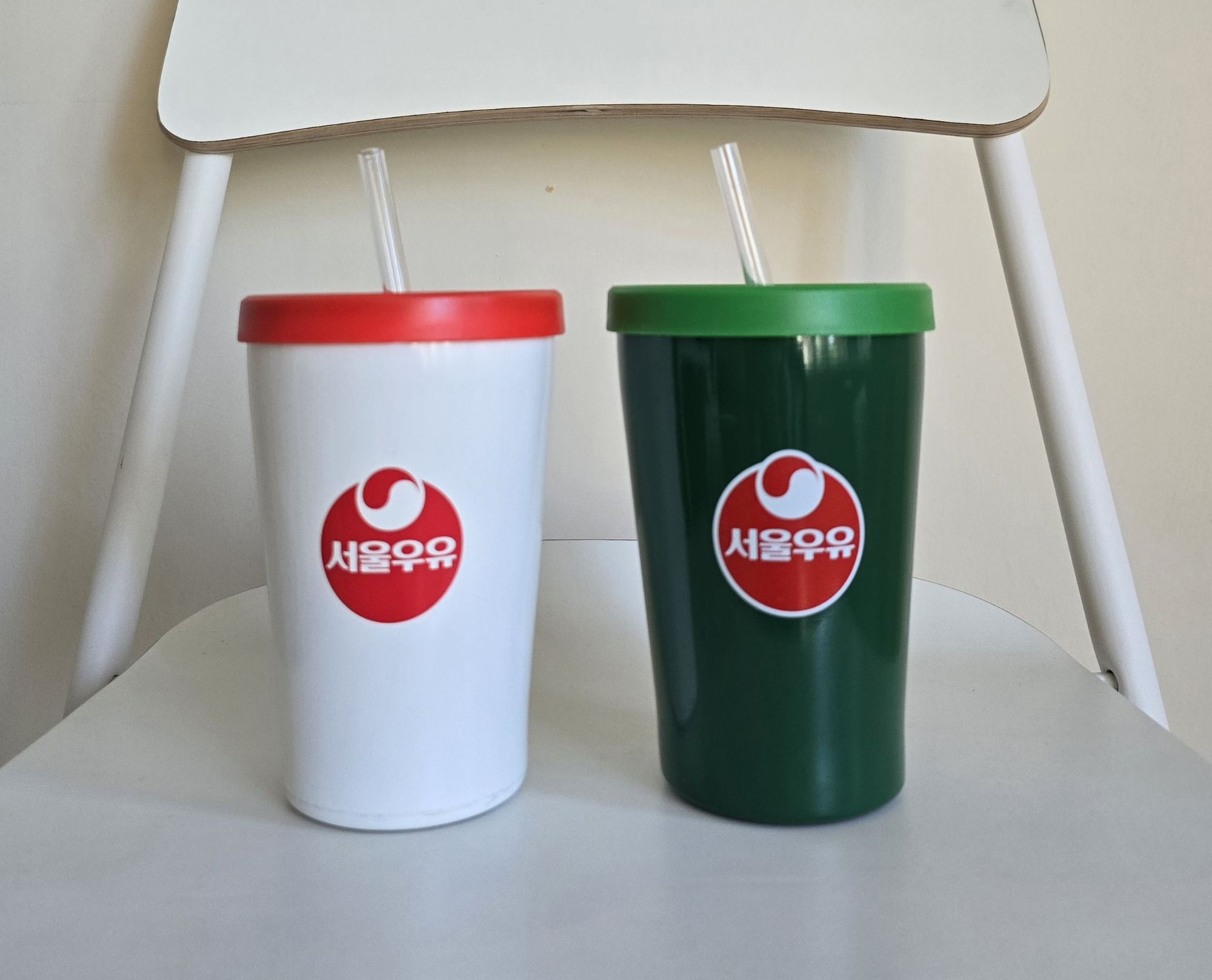 서울우유 옛 감성 클래식 디자인의 텀블러 2개 팝니다 뚜껑, 빨대 모두 분리 가능하고 컵이랑 교차로 구성가능해요. 용량은 약 300ml~330ml 정도 입니다 Park la brea 에서 거래원해요