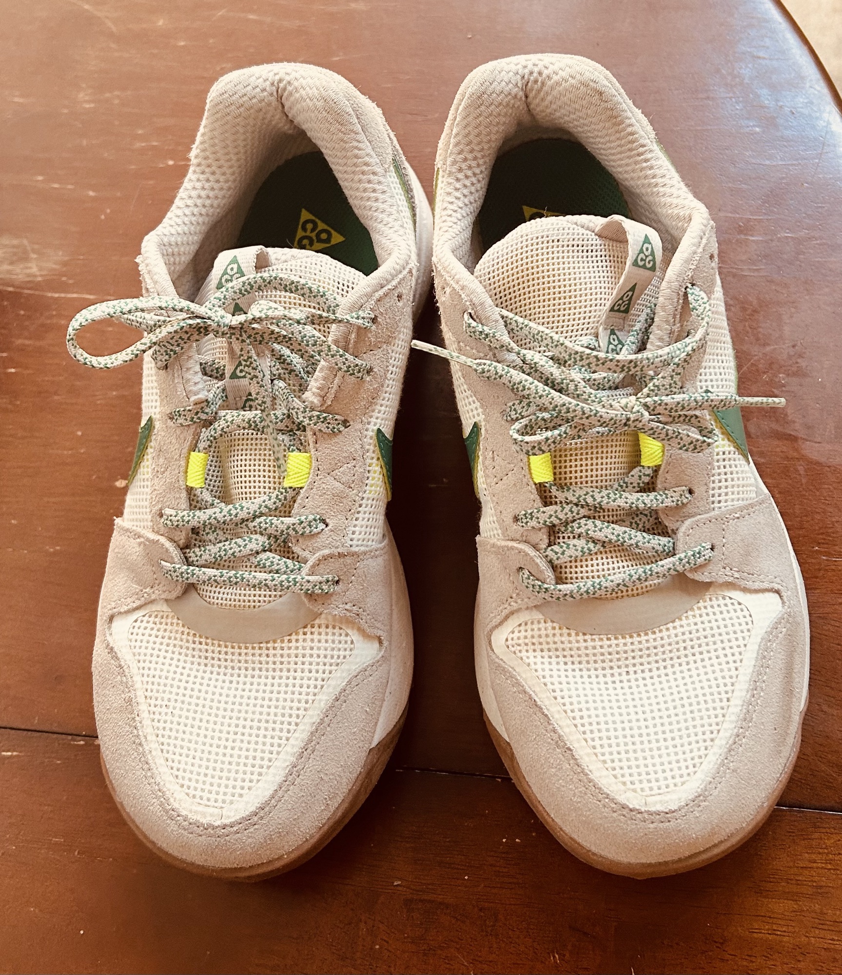 나이키 ACG 로우케이트(Nike ACG Lowcate) 베이지/그린 컬러 판매합니다. 아웃도어 활동은 물론 데일리 운동화로도 활용도가 정말 높은 모델입니다. • 사이즈: US 여성 6 (약 230mm) • 상태: 바닥 솔(돌기) 보시면 아시겠지만 마모가 거의 없는 아주 깨끗한 상태입니다. 전체적으로 오염 없이 관리 잘 되어 있습니다. • 특징: ACG 라인이라 내구성이 좋고, 쿠션감이 있어 오래 걸어도 발이 아주 편합니다. '꾸안꾸' 스타일에 딱 맞는 디자인이에요.