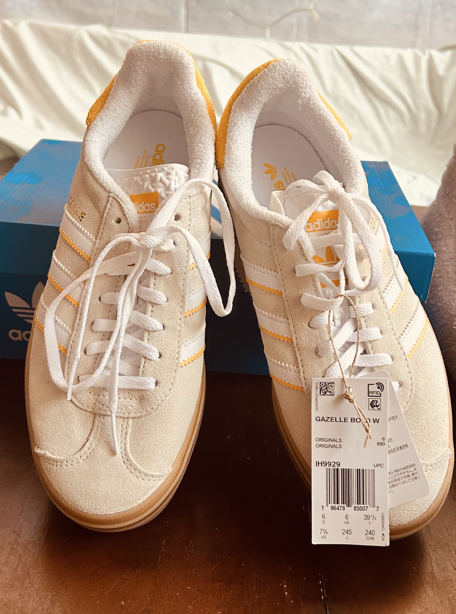 신발 상자(박스)와 신발 속지, 택까지 그대로 있는 풀구성 새 상품입니다. 사이즈 확인차 집에서 한 번 신어본 게 전부인데, 저한테는 사이즈가 커서 아쉽게 내놓습니다. • 상태: 미사용 새 제품 (박스 포함 풀구성) • 사이즈: US 여성 7.5 (약 245mm) • 특징: 3단 플랫폼 굽이 있어 키높이 효과가 있고, 색감이 정말 화사하고 예뻐요. 가젤 볼드는 일반 가젤보다 굽이 있어서 비율도 좋아 보이고, 색 조합이 화사해서 청바지나 스커트 어디에나 잘 어울리는 인기 모델이에요. • 상태: 새 상품 • 사이즈: US 여성 7.5 (한국 사이즈 약 245mm) • 참고: 가젤 볼드 모델이 살짝 크게 나오는 편이라 245~250 신으시는 분들께 잘 맞을 것 같아요.