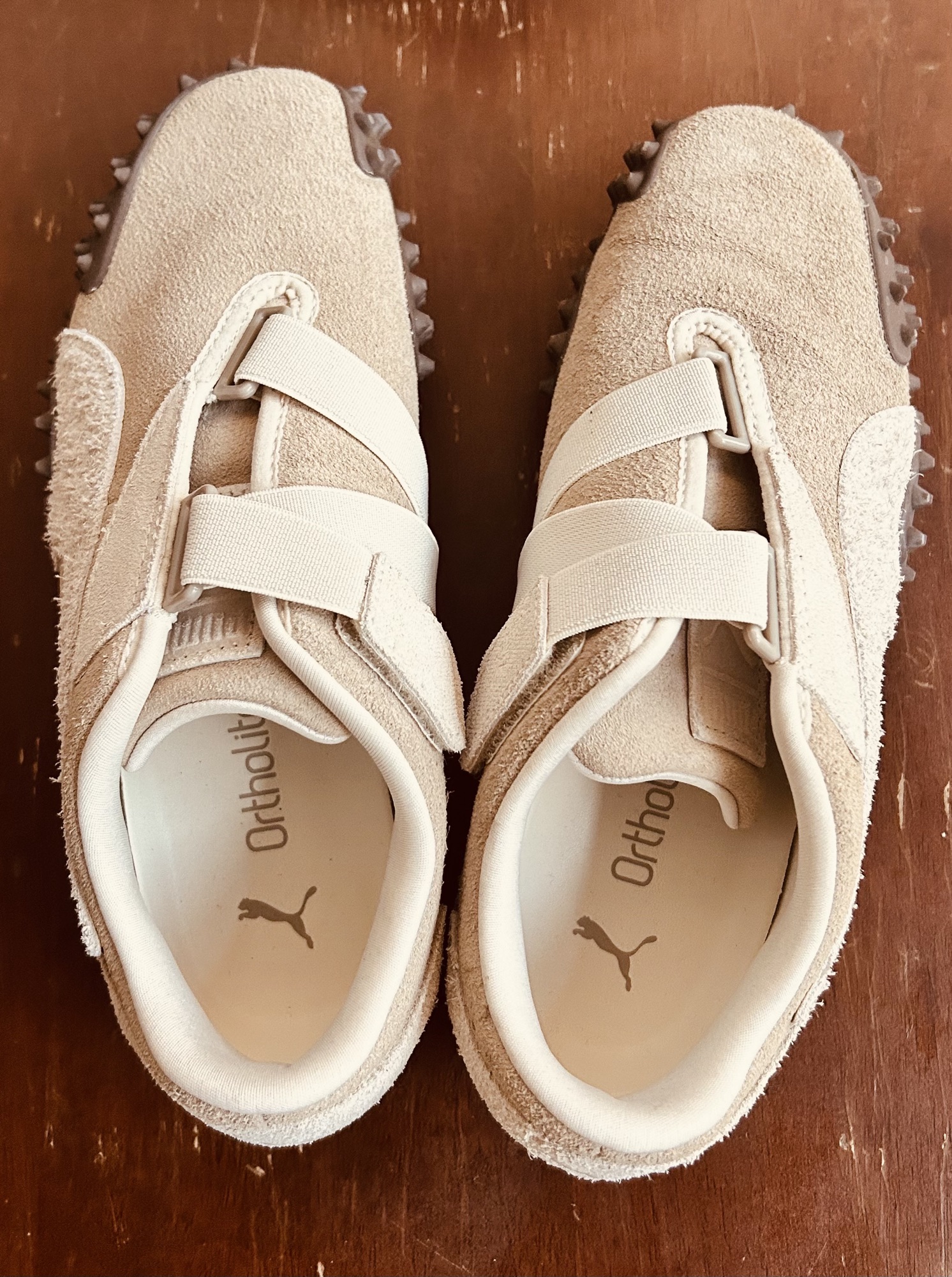 퓨마의 아이코닉한 모델인 모스트로(Mostro) 베이지 스웨이드 판매합니다. 디자인이 정말 유니크하고 세련된 제품이에요. • 브랜드/모델: 퓨마 (Puma) 모스트로 • 사이즈: US 7.5 (한국 사이즈 약 245mm 정도) • 상태: 사진 보시다시피 바닥 돌기도 거의 닳지 않았고, 전체적으로 아주 깨끗한 컨디션입니다. 내부 인솔(Ortholite) 로고도 선명합니다. • 특이사항: 이 모델은 디자인 특성상 발볼이 좁게 나온 '칼발용'입니다. 저는 발볼이 있는 편이라 조금 작게 느껴져서 아쉽게 내놓습니다. 평소 발볼이 좁으신 분이나, 240 정도 신으시는 분이 여유 있게 신으시길 추천드려요.