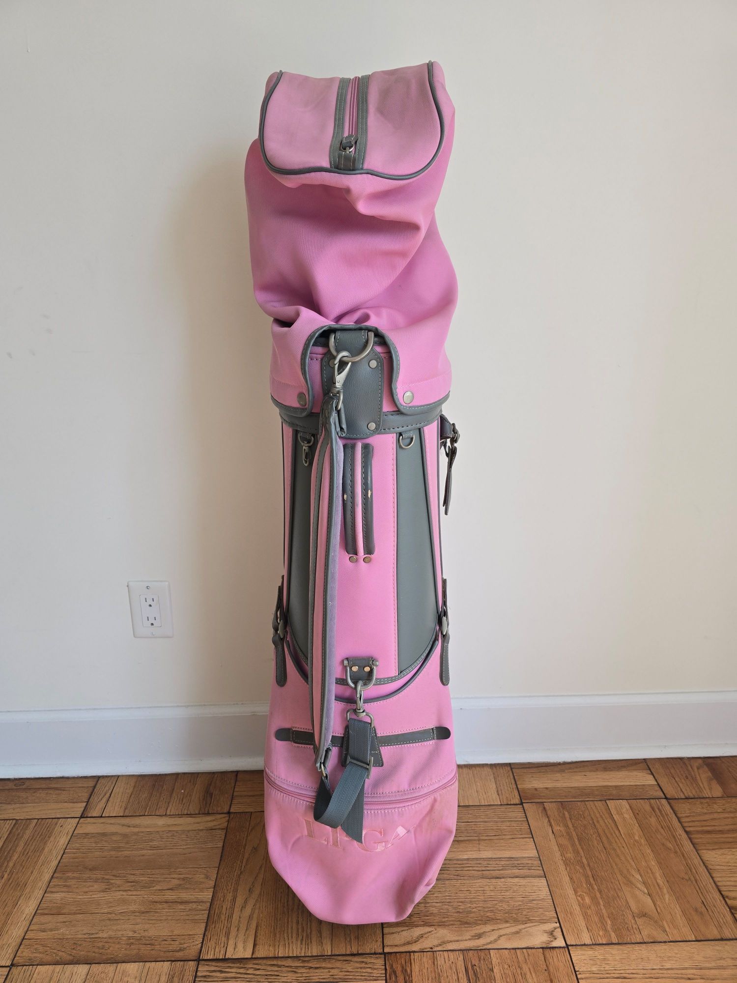 여성 LPGA 골프백 입니다 손잡이 부분 가죽 살짝 벗겨짐, 아랫쪽 주머니쪽 천 부분은 약간의 얼룩과 사용흔적 있어요(사진참조) 찢어지거나 망가진 부분은 없습니다. 바퀴나 지지대 없는 골프백입니다. 편하게 부담없이 쓰시면 좋을 것 같네요 Park la brea에서 거래원해요