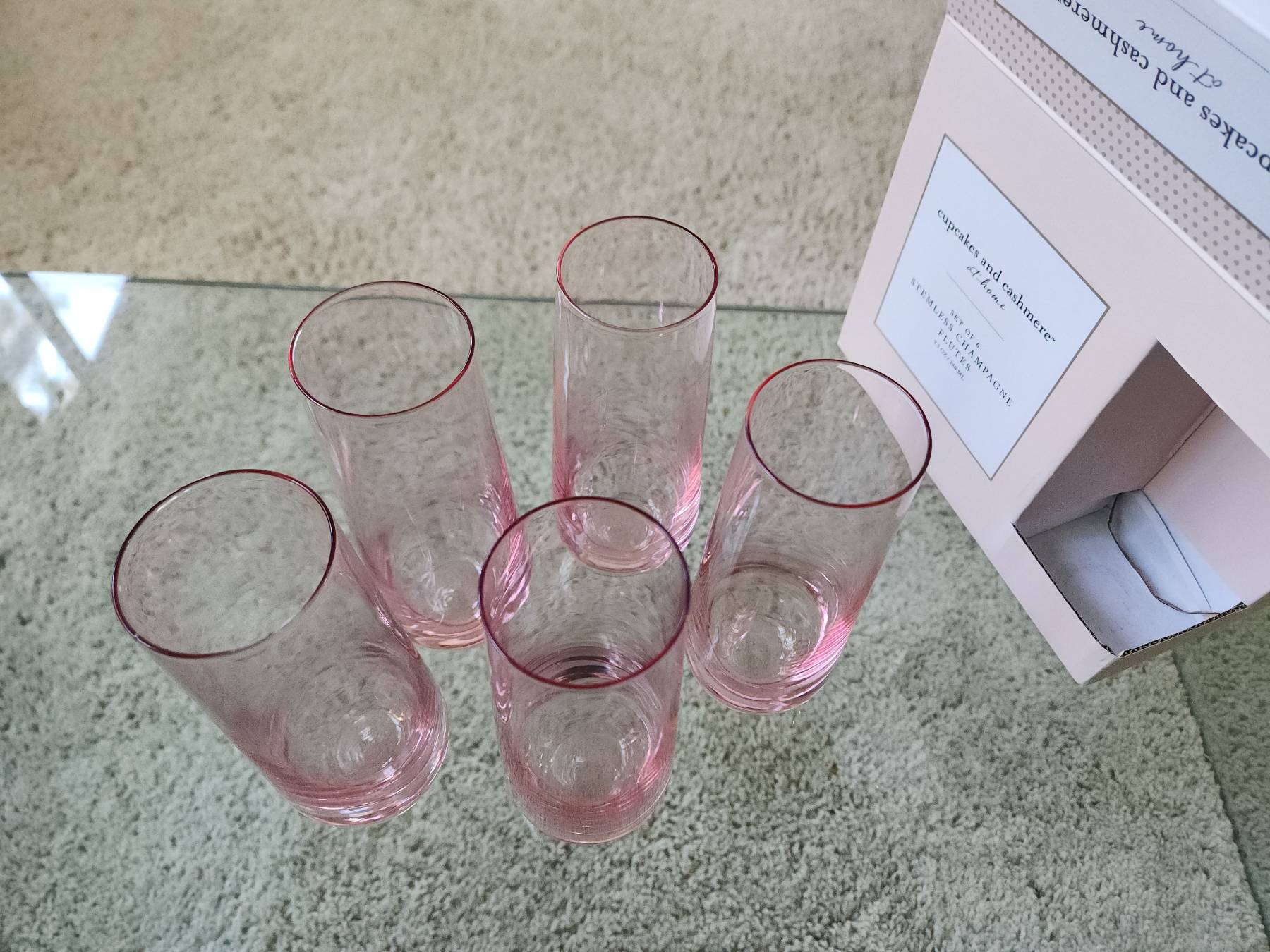 친구들 초대한다고 홈굿즈에서 구매하고 딱 한 번썼어요. 그리고 세척하다 한 개는 바로 깨뜨렸네요. 연한 핑크빛 아담한 사이즈 예쁜 유리잔입니다. 새 박스 통째 5개입니다. 음료, 와인, 주스잔등으로 사용하세요. Cash only, Pick-up only, No return