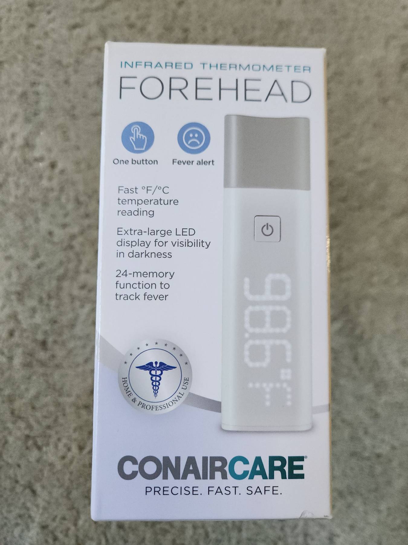 진단받고 겁나서 덥석 구매한 체온계. 정작 사용할 일이 없었네요. CVS에서 $45에 구매 가볍고 손에 감기는 사이즈에 사용하기 너무 편리합니다. 섭씨, 화씨 전환가능. 10개 측정체온 자동저장. 비접촉식이라 위생적. AAA사이즈 배터리 2개 사용. 필요하신 분 가져가세요. Cash only, Pick-up only, No return