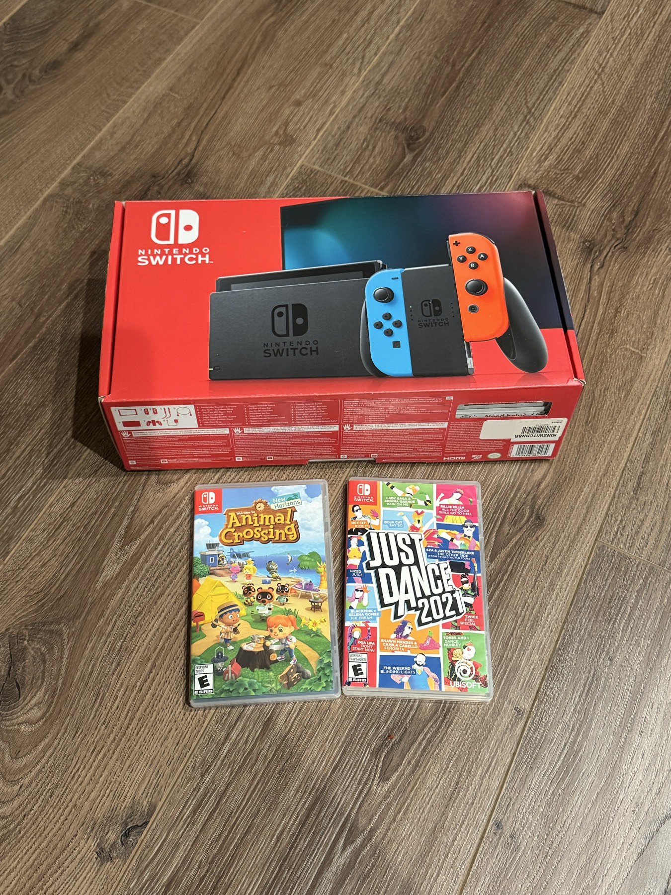 닌텐도 스위치 모든 구성품 다 있습니다. - 콘솔 - 조이콘 좌/우 - 조이콘 스트랩 - HDMI 케이블 - 스위치 도크 - 조이콘 그립 - AC 어댑터 구매 후 두세번 정도 사용하고 박스에 보관하여 상태는 최상입니다. 게임을 잘 하지 않아 판매합니다. 별도 판매하는 게임카드는 - 동물의 숲 Animal Crossing New Horizon: $35 - 저스트댄스 2021: $5 일괄 구매하시면 $230 에 세가지 다 드릴게요. 코리아타운 거래 원합니다.