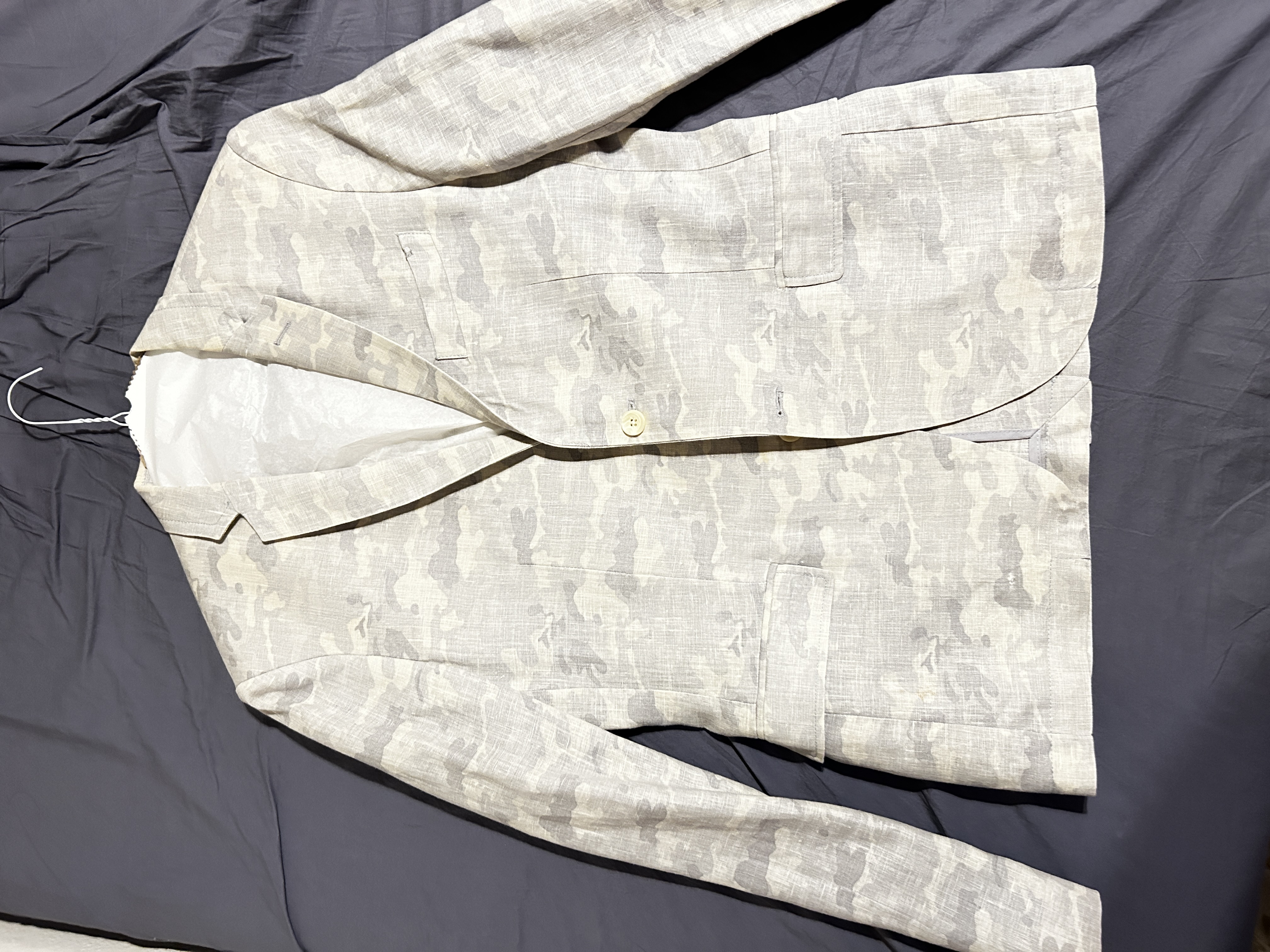 Zara의 여름용 캐즈얼 정장 자켓이에요. 소재는 마구요 시원하고 회색 카모 모양이 센스입니다. 보통남자 기준 L사이즈 입니다. 트레이닝으로 몸이커져 사이즈가 안맞게되어 필요하신분에게 양도해드립니다.