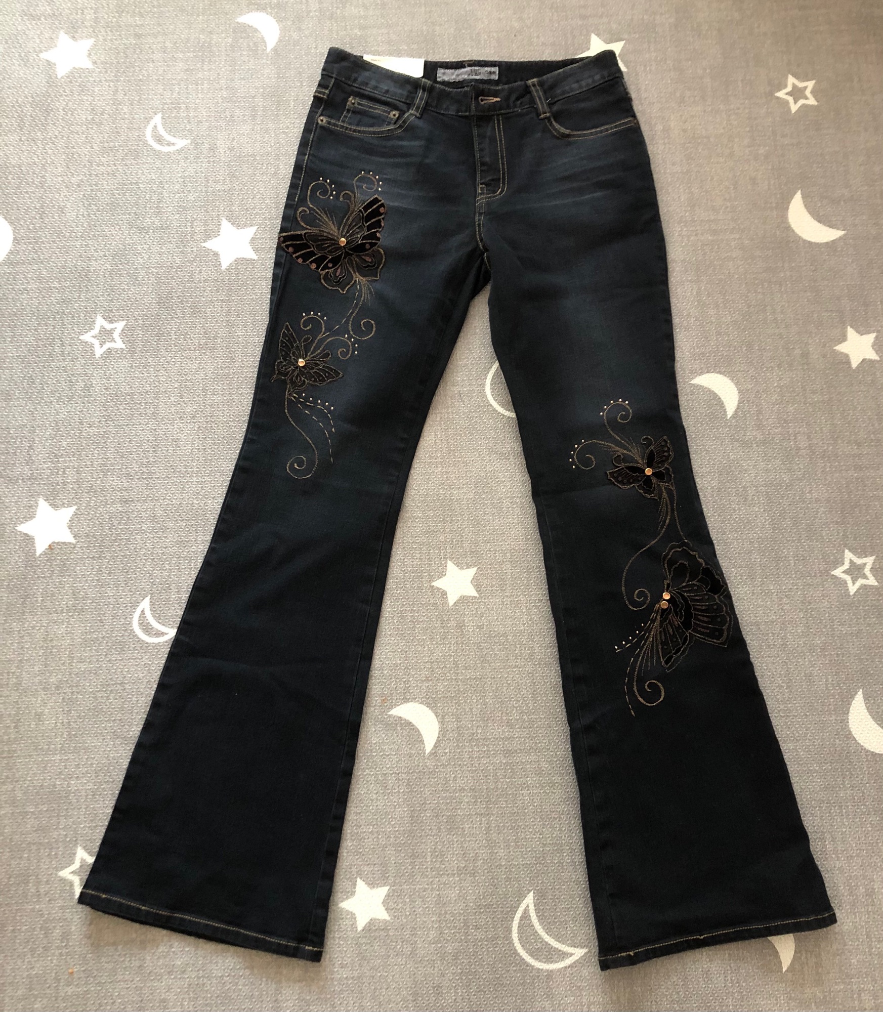 사이즈 28 부츠컷으로 다리가 길어보여요 허벅지쪽 큐빅과 자수 장식이 독특한 청바지~ 역시 한국서 건너온 바지네요 ^^