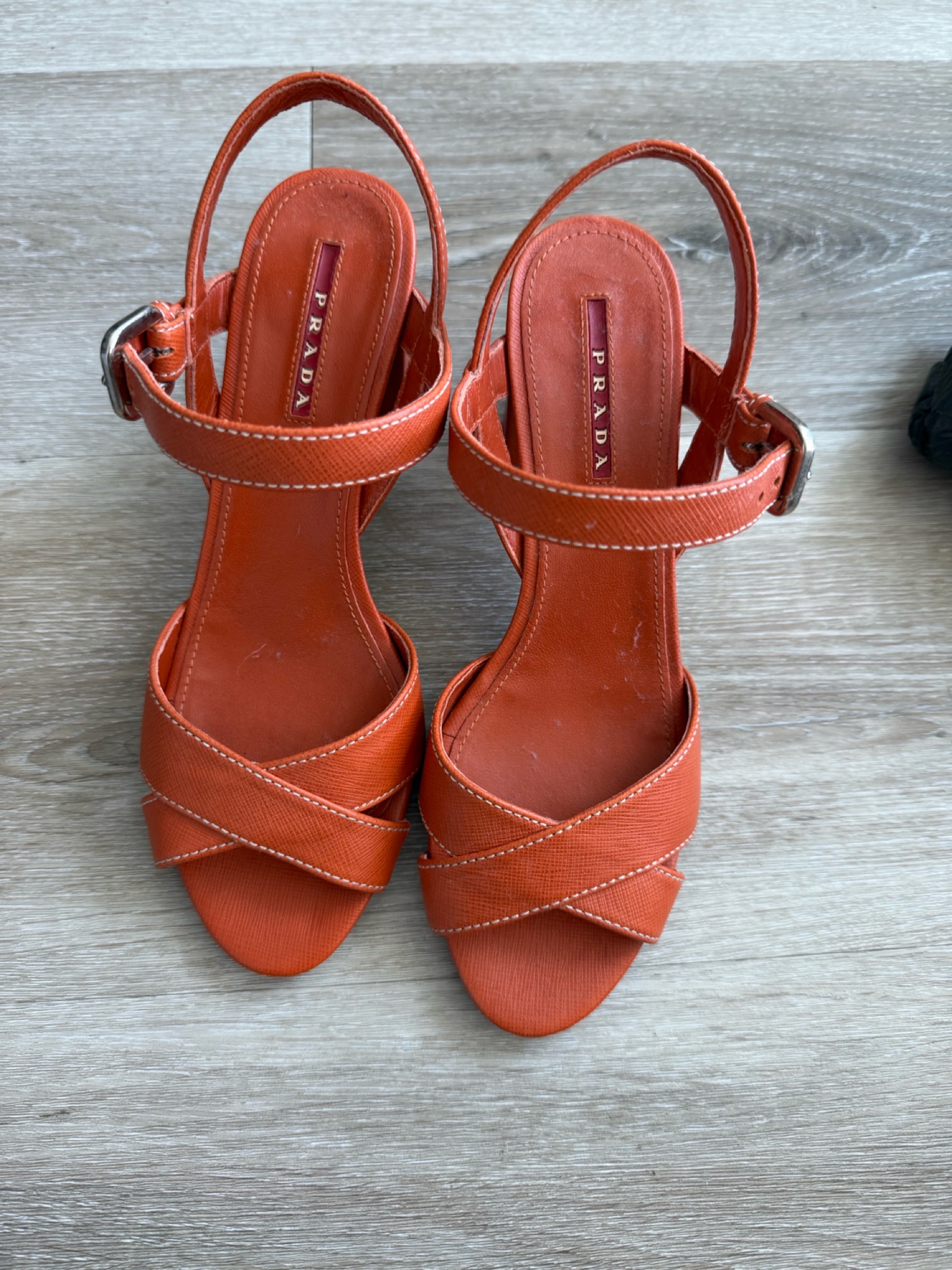프라다 중간높이 샌달이예요. 스크래치 강한 가죽 소재이구요. 중간높이 통굽에 바닥이 약간 고무? 처리 되어있어서 아주 편해요. 사이즈는 235 , 61/2 힐은 2.8 인치 색상오렌지 정가 $ 600정도 였구요 오랜지는 1회 착용이라 $180에 판매합니다. 박스 있어요! 제가 힐을 더 이상 못신어서 가지고 있다가 판매하구요. 다른 제품도 포스팅 되어 있으니 검색해 주세요!
