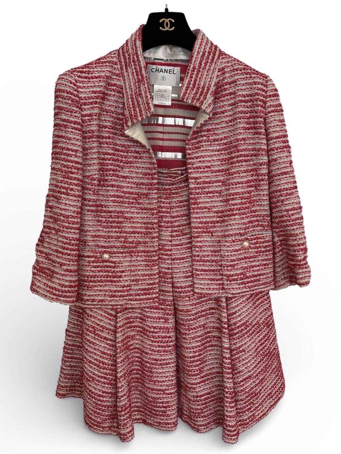 2001년 봄 시즌 01P 컬렉션 제품입니다. 프랑스 생산 정품. 구성: • 펄 버튼 디테일 트위드 자켓 • 동일 원단 A라인 스커트 • 실버 스트라이프 디테일 실크 탑 컬러: 레드/아이보리 + 실버 사이즈: FR 40 초기 2000년대 샤넬 아카이브 제품으로 희소성 있는 컬렉터 피스입니다. 빈티지 특성상 미세 사용감 있으나 전체 컨디션 우수. 라벨 모두 보존. 3피스셋트로만 판매원해요. 발렌시아. 한타부근직거래가능. 젤벤모가능.