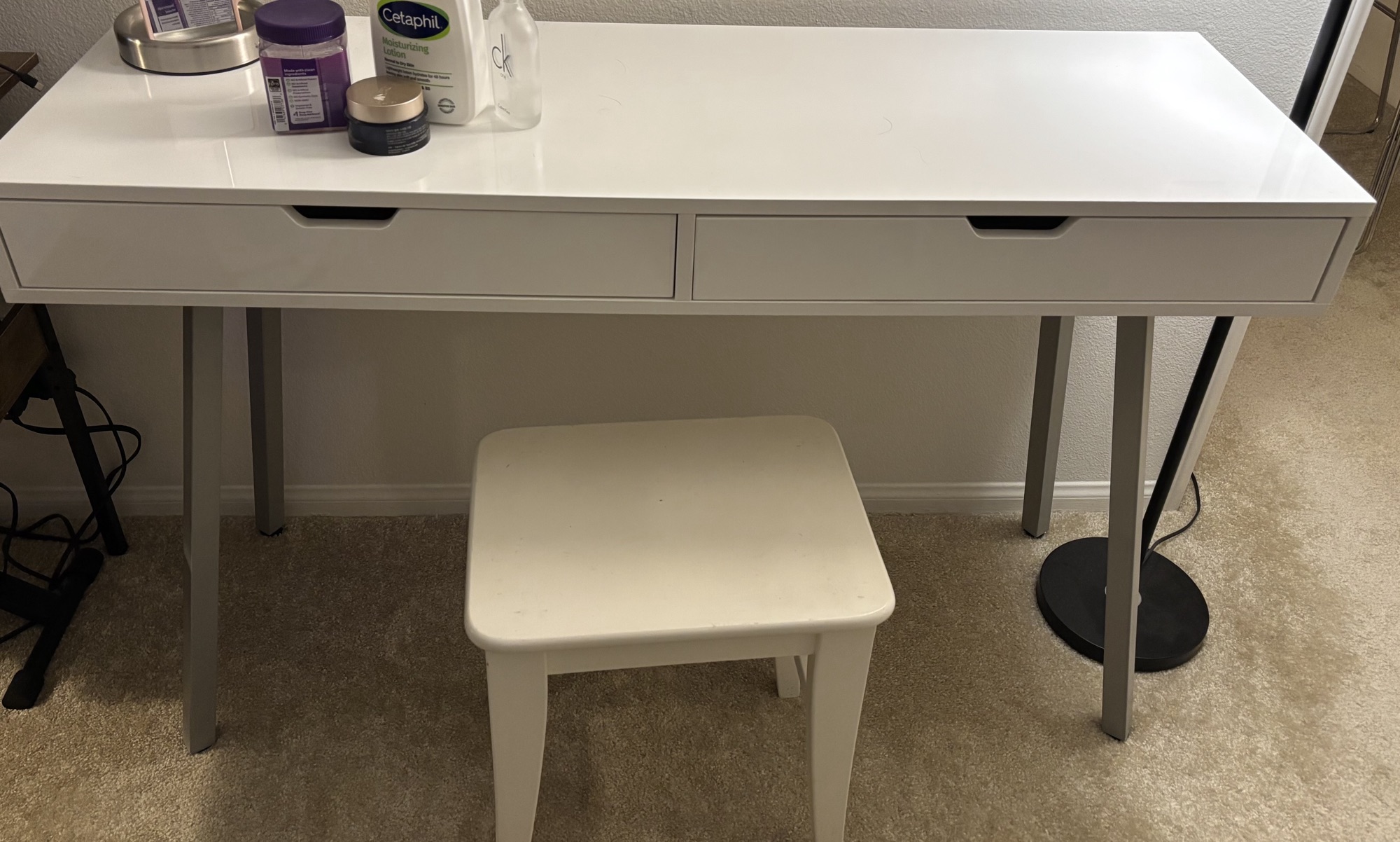 서랍2개짜리 화장대-의자-벽걸이 거울 세트로 80불에 판매합니다. 깨끗하게 써서 사용감 없습니다. 화장대 다리는 분해 후 운반 가능합니다.