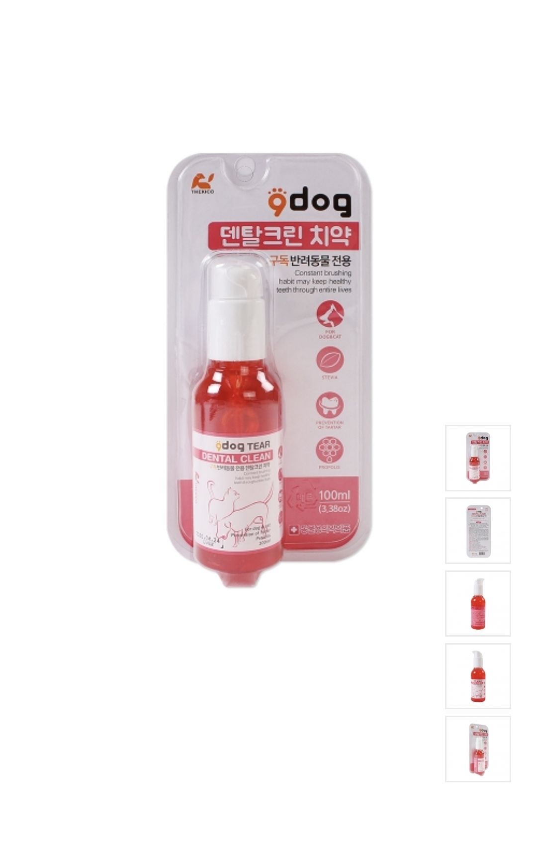 구독(9dog) 덴탈크린 치약 100ml는 반려동물(강아지/고양이)용 젤 타입 치약입니다. 달콤한 딸기향으로 기호성을 높였으며, 규칙적인 사용으로 치석 및 치태 예방과 구강 위생 관리에 도움을 줍니다. 주식회사 더키코 주식회사 더키코 +2 주요 특징 및 정보 용량: 100ml 타입: 젤(Gel) 타입 (칫솔이나 손가락으로 잇몸에 도포) 특징: 알코올, 자일리톨 무첨가, 섭취 가능 안전 성분 하루 1~2회, 칫솔에 묻히거나 손가락으로 직접 반려동물의 치아와 잇몸에 발라주면 되며, 과도한 타액 분비가 적어 관리가 용이합니다