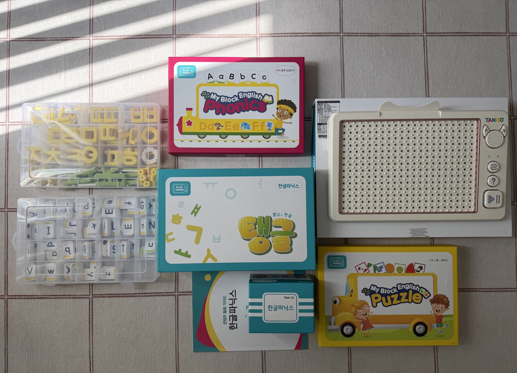 플레이 탱고 한글/영어/퍼즐 3종 세트 깨끗하게 사용했습니다 한글 자/모음 보관하는 플라스틱 통 살짝 깨진거 말고는 그대로입니다. 구매 의사 있으신 분들 연락주시면 더 자세한 설명 드릴게요.